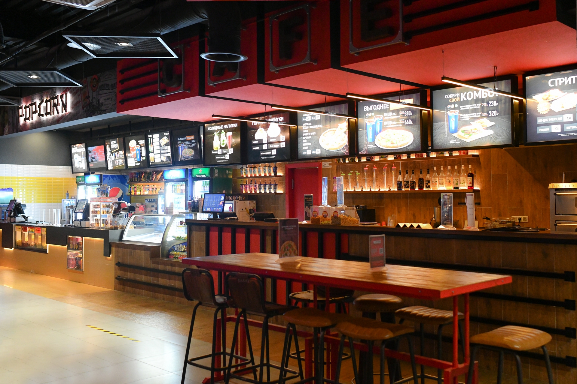 В зоне бара гостей ожидают 6 удобных столиков как для одного, так и для большой компании. Ассортимент бара может удивить: здесь есть разнообразные напитки, снеки, сладости, мороженое, разливное и бутилированное пиво, молочные коктейли, домашний лимонад стрит-фуд: сэндвичи, панини, шаверма, наггетсы, сырные палочки, картофель фри и пицца. Уютная атмосфера, вкусная пища, качественное обслуживание и интересное кино на ваш выбор – это замечательная возможность прекрасно провести время.